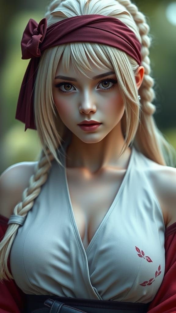 This image shows a photorealistic portrait of Tsunade, the Fifth Hokage from Naruto. The solo shot captures her distinctive features and attire with sharp focus and natural lighting.