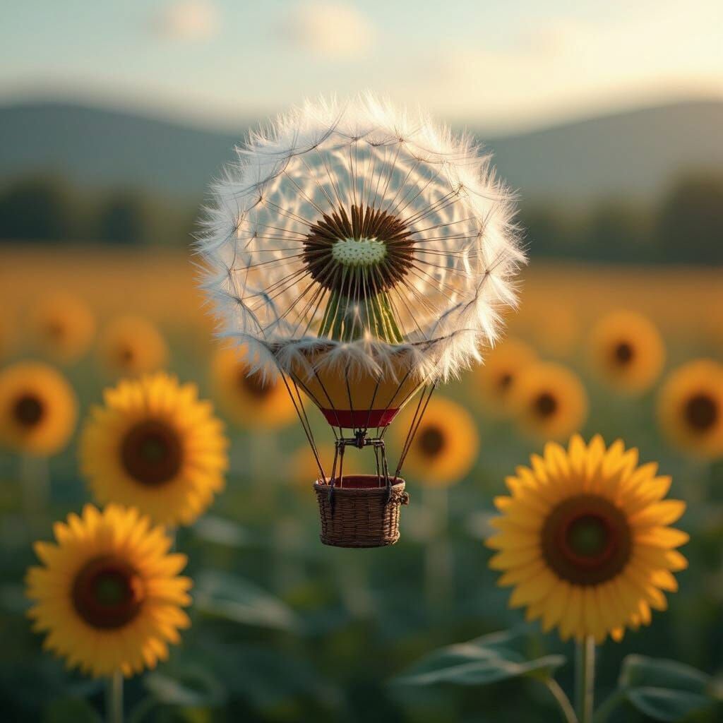 This image shows a dandelion transforming into a small hot air balloon floating above sunflowers. Rendered in a surrealist style, the image features soft lighting and dreamy colors.