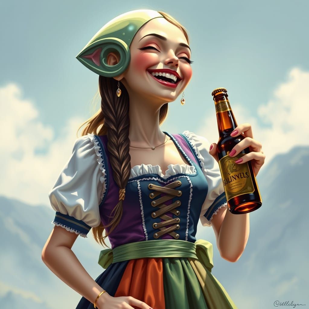 A whimsical alien woman is dressed in a traditional Dirndl. She's laughing and holding a beer bottle, with attention to detail and futuristic flair.