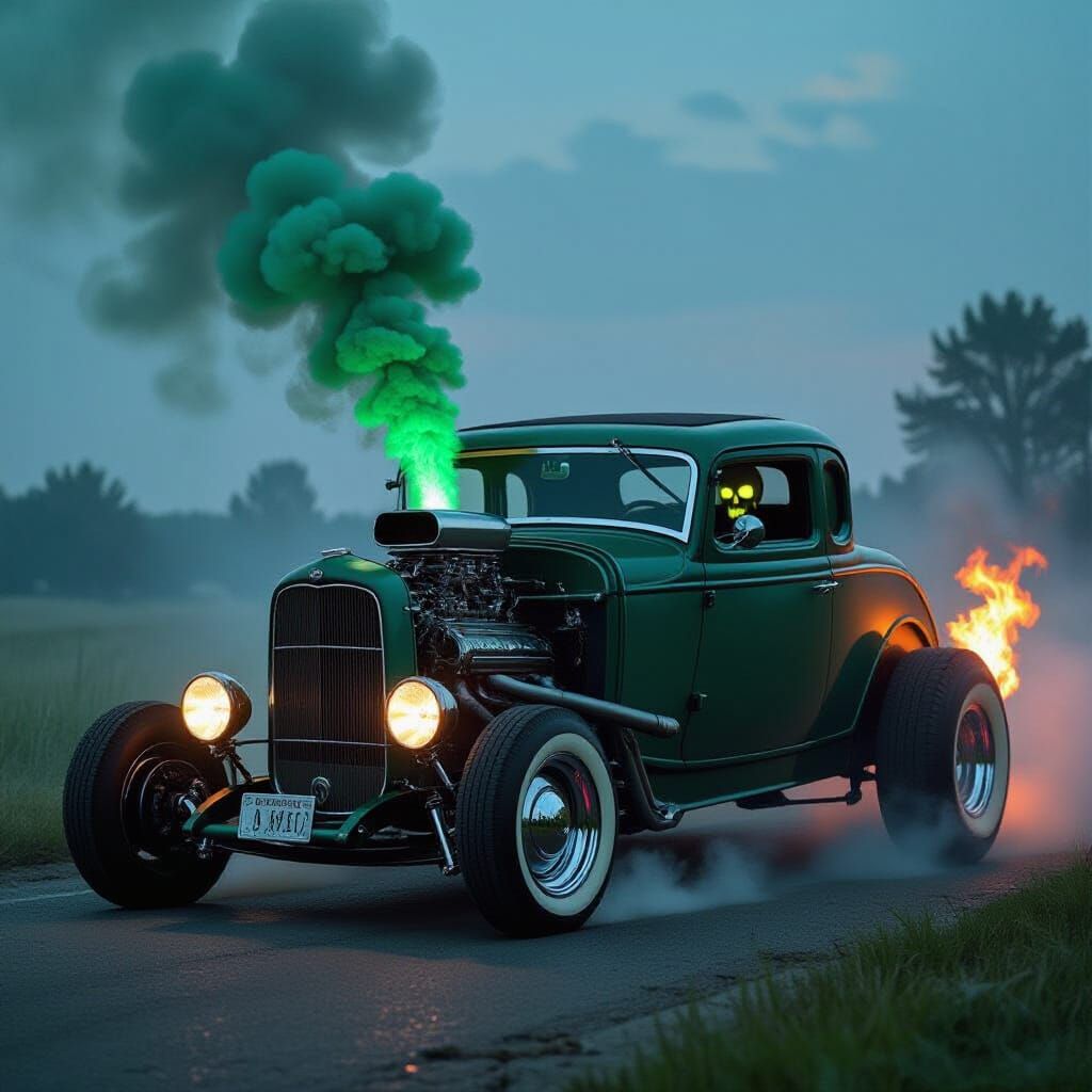 This image shows a ghostly hotrod '32 Ford coupe possessed by a supernatural presence. Green smoke billows from the exhaust, with flames and a skeletal driver visible within, rendered with digital art techniques.