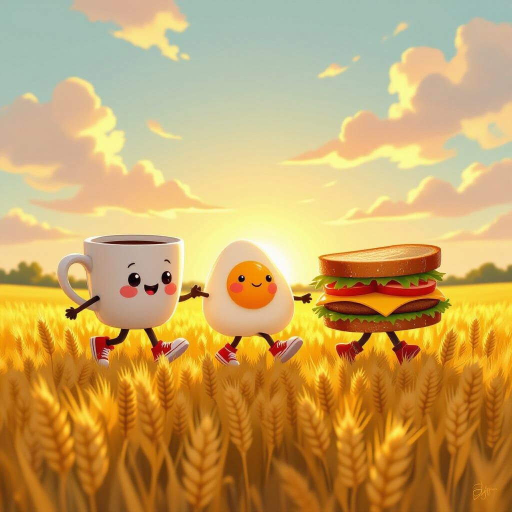 This image shows a cheerful coffee cup, fried egg, and vegetable sandwich walking through a wheat field at sunrise. This vibrant digital art style blends realism and fantasy.