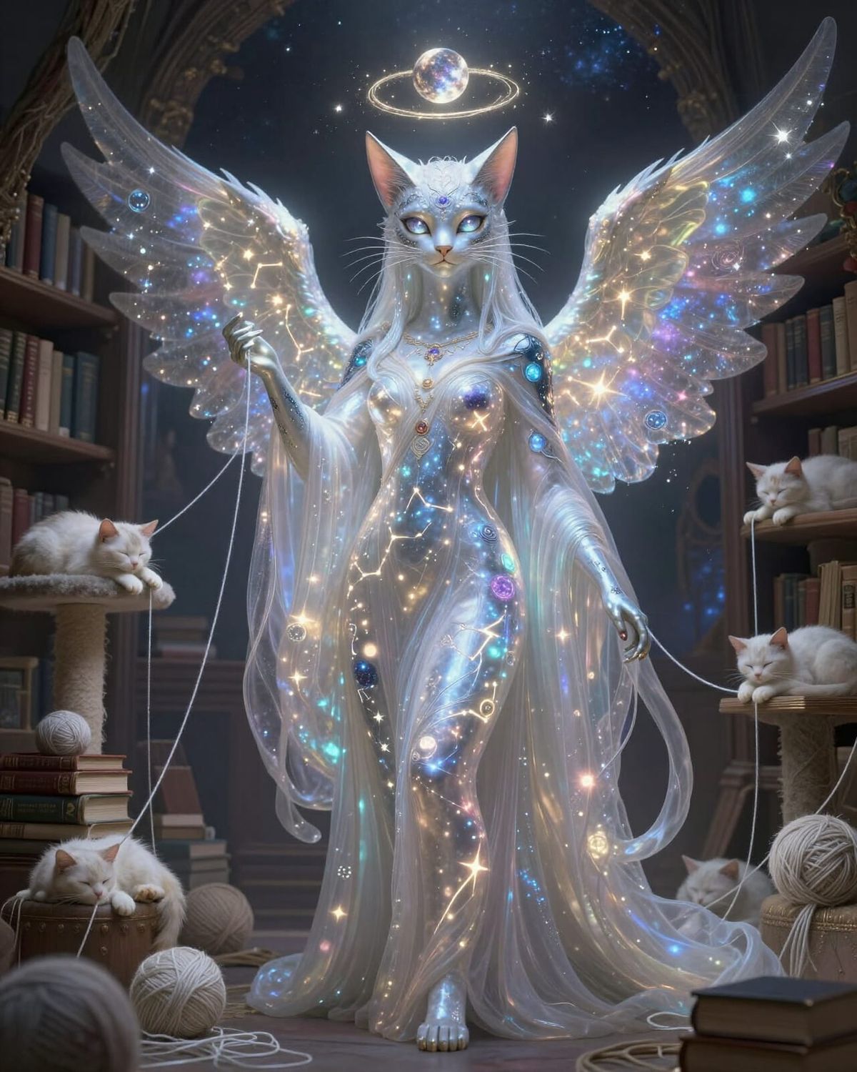 This image depicts the majestic Feline Deity, a tall, androgynous being with cat-like features, cloaked in moonlight and nebula dust. They stand in a dream library of yarn and scratching posts.