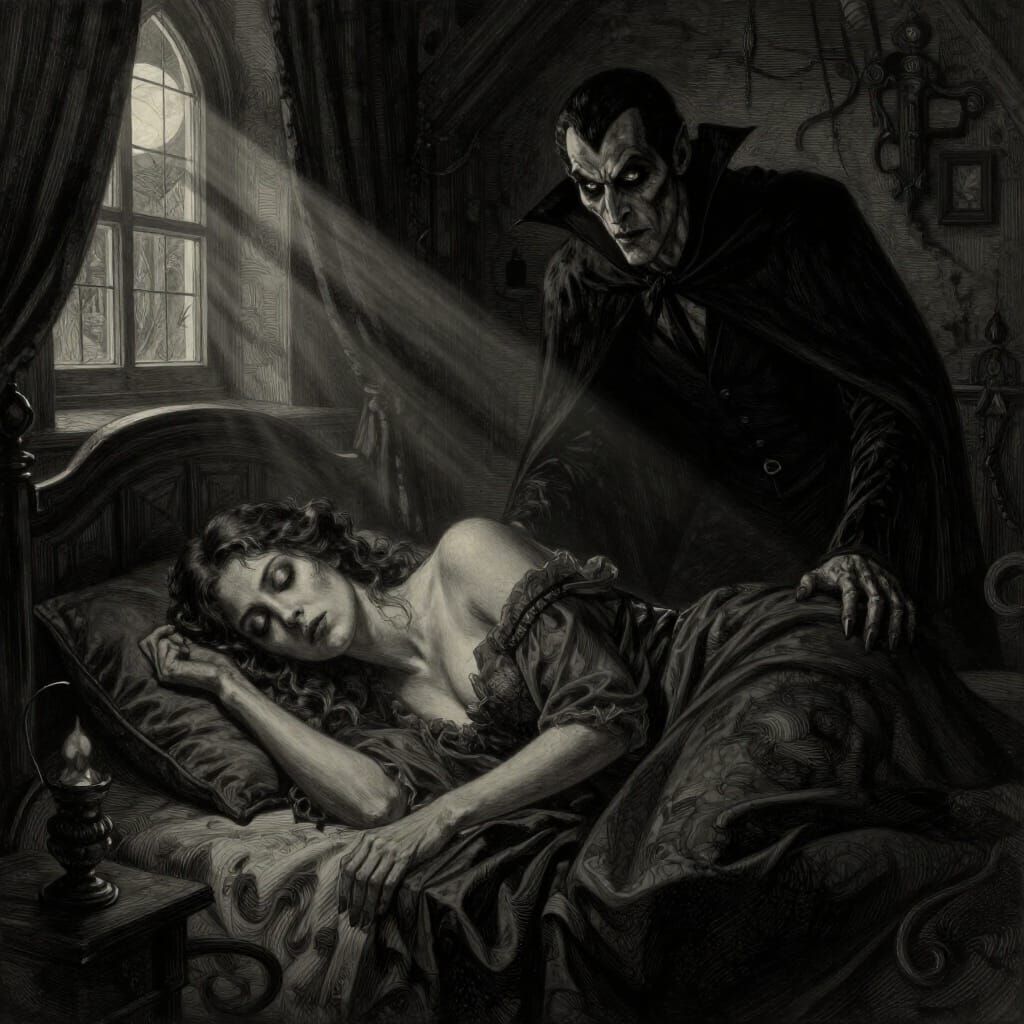 This image depicts a woman sleeping in a dark chamber as a vampire lurks in the shadows. Rendered in a dramatic gothic horror style with moonlight and eerie shadows.