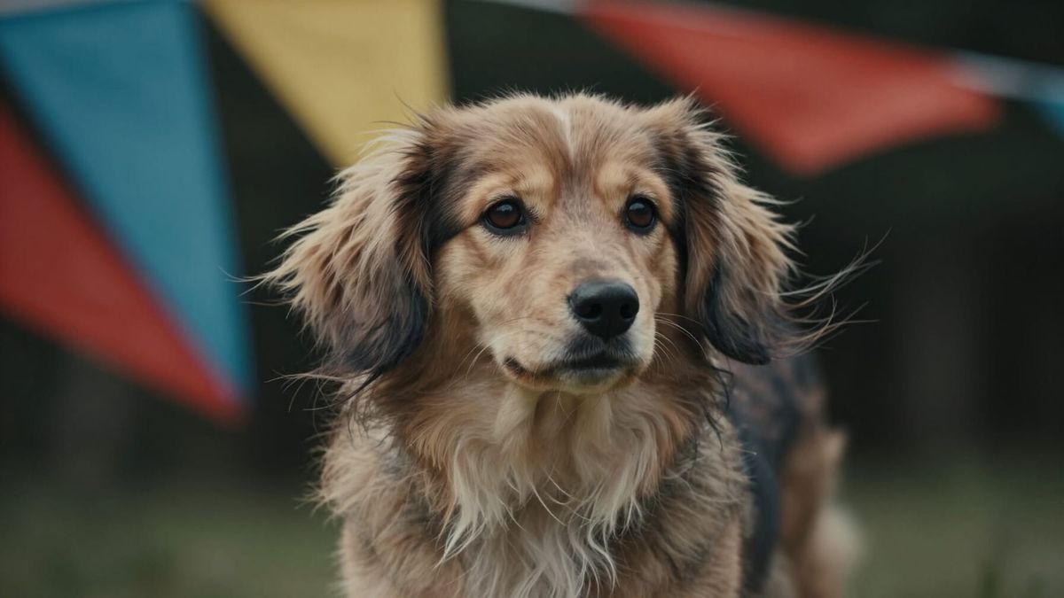 This 8K photograph captures a fluffy puppy with its fur blowing in the wind, set against a bokeh background of flapping flags. Features shallow depth of field and soft, dramatic lighting.