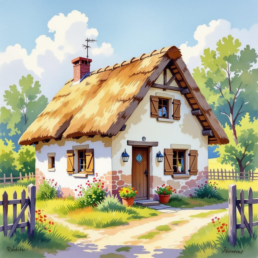 This image shows a quaint thatched cottage rendered as a realistic watercolor painting. The style emphasizes delicate brushstrokes and natural color variations.