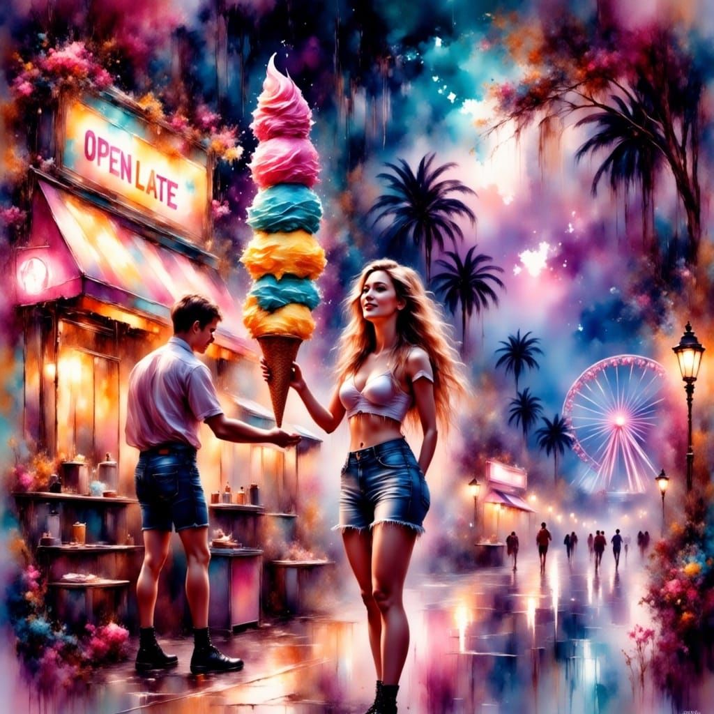 This image shows a girl with an ice cream cone on a neon street at night. The scene is rendered in a synthwave aesthetic, capturing the vibrant atmosphere of a retro boardwalk.