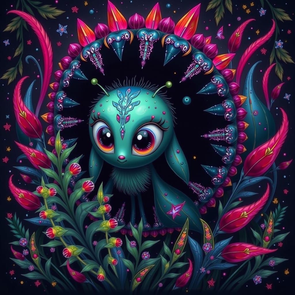 A striking picture of a furry, round-eyed creature amidst vibrant flora in a dense forest. The image blends bold patterns and textures in a whimsical, colorful illustration aesthetic.