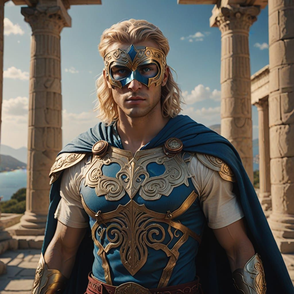 This cinematic image showcases a young superhero in an intricate Ancient Greek costume and mask. Featuring flowing blonde hair and ethereal blue eyes, rendered in hyperrealistic detail with dramatic lighting.
