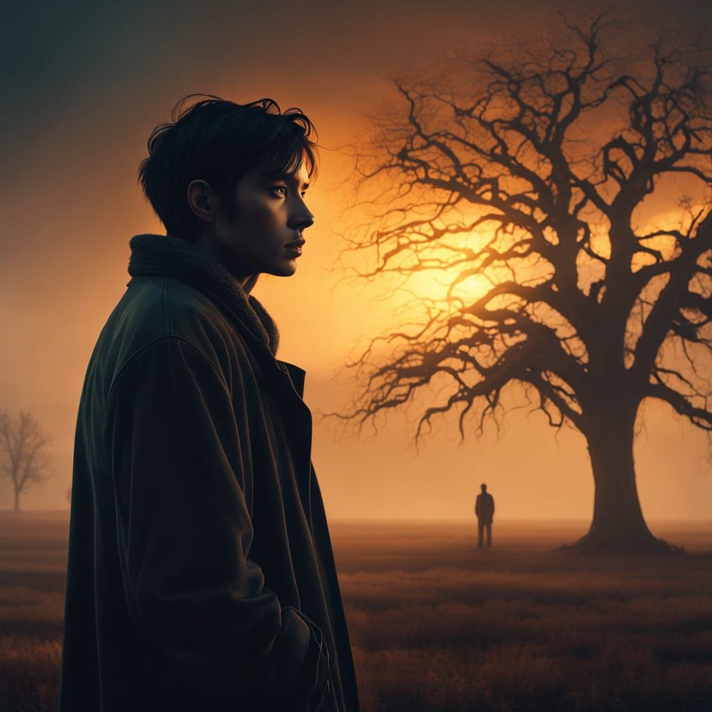 This image shows a solitary figure standing in front of a tree. Soft light illuminates their face, casting gentle shadows. The digital art features muted colors and a sorrowful, moody atmosphere.