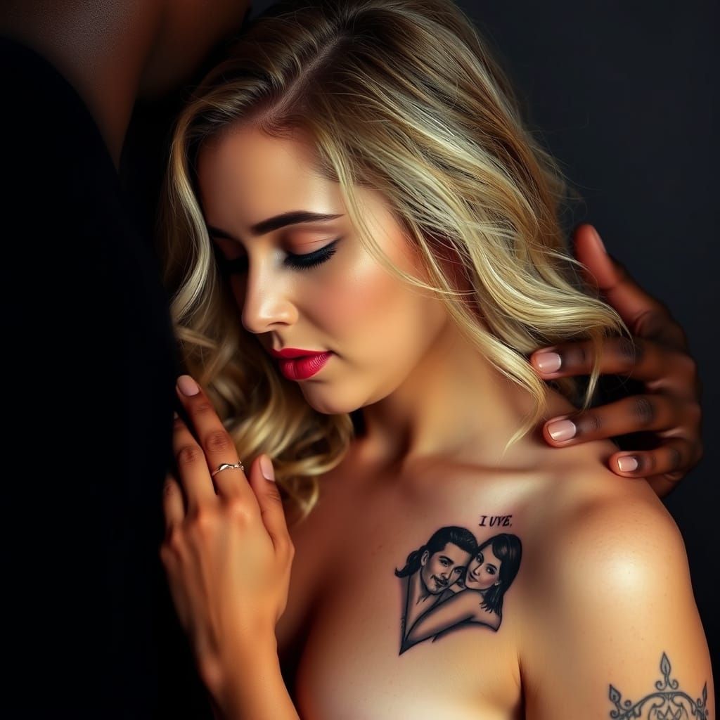 A touching image of a blonde woman with tattoos. A Black man's hand gently touches her shoulder from behind. The woman has a tattoo of her soulmate's face above her heart.