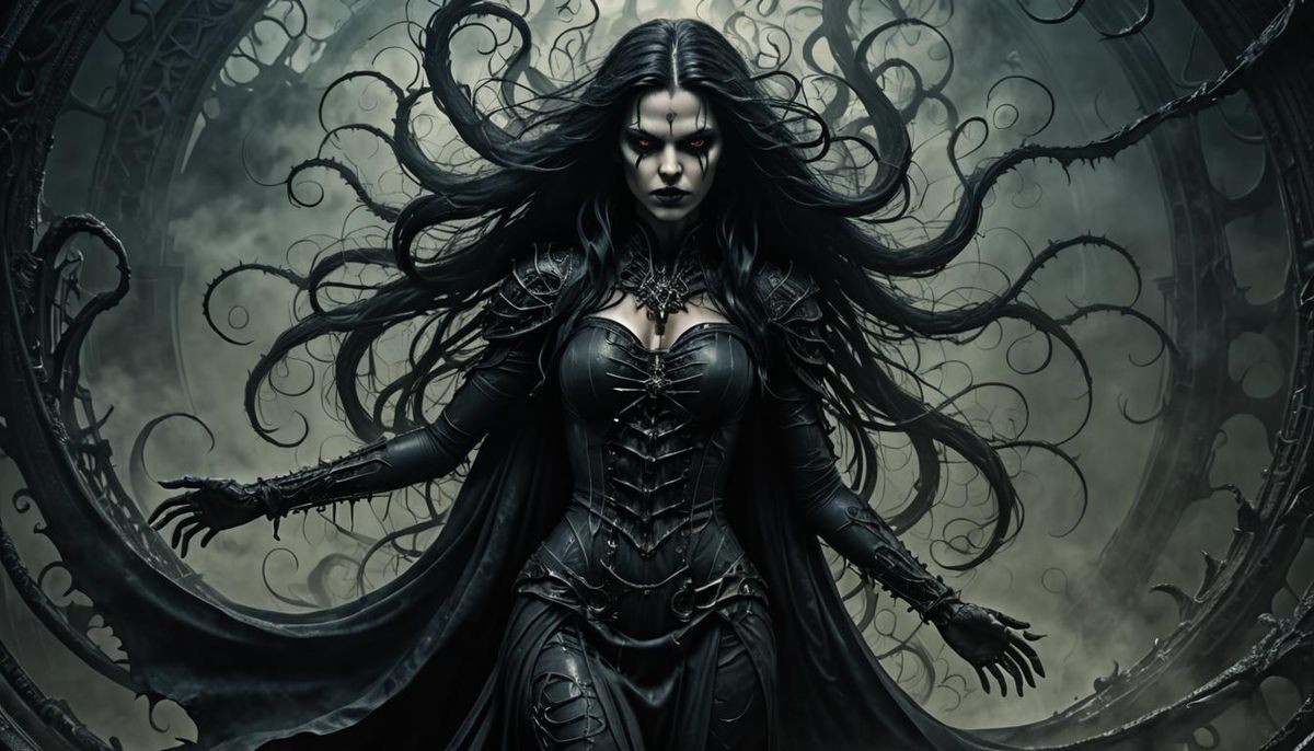 A captivating image of a female vampire with long black hair, surrounded by swirling mists. The art is a realistically detailed matte painting with deep colors and intricate detail in a grimdark style.