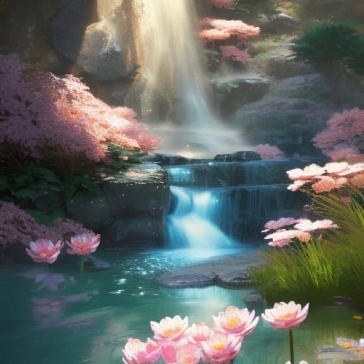 A vibrant image of a waterfall cascading into a koi pond, surrounded by pink flowers. The scene is rendered with dynamic lighting and intricate detail, in an Art Nouveau style.