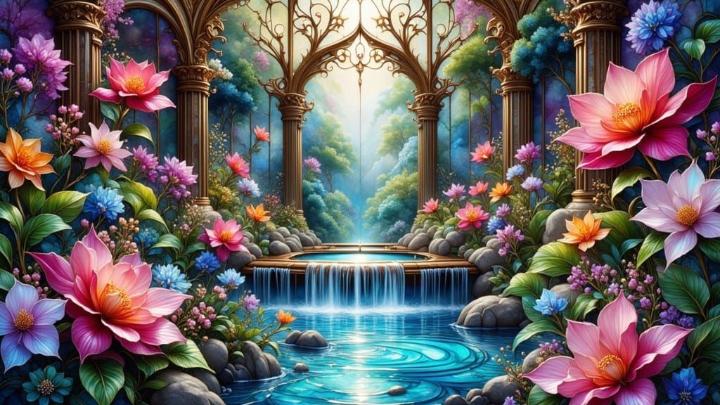 A beautiful mystical temple courtyard Garden blooming with life