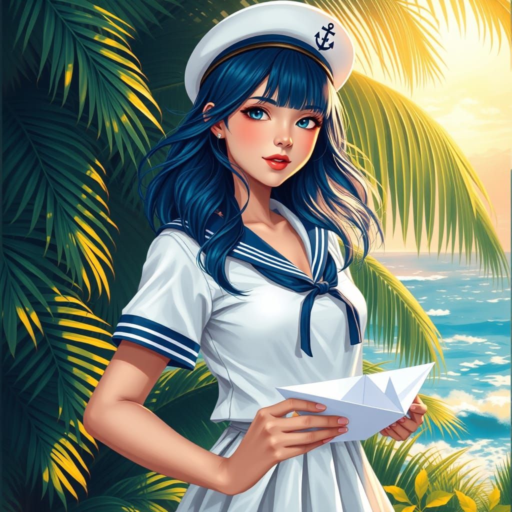 A vibrant, hyperrealistic tropical oil painting in a classic gouache style. The scene features a young woman with deep blue and teal hair, styled in loose waves. She wears a beautiful sailor hat adorned with a small anchor emblem, a stylish white sailor suit with blue accents, and a short pleated skirt, ...