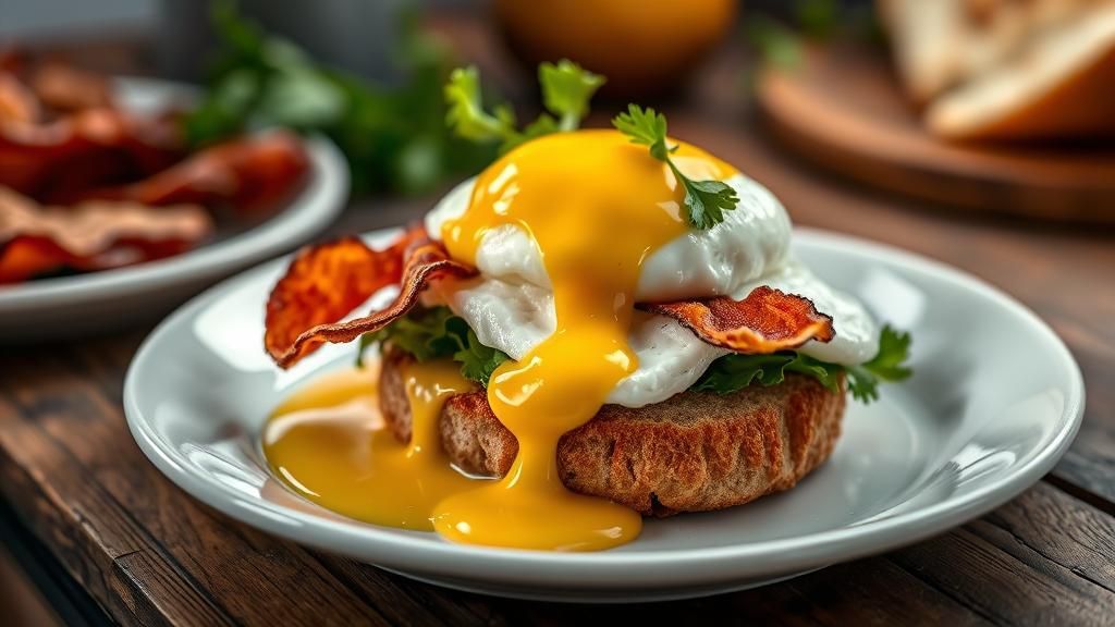 This image shows an exquisitely arranged muffin egg breakfast on a white plate. The dish features fresh lettuce, a fried egg, bacon, and hollandaise sauce, set on a rustic wooden table in warm, natural lighting.
