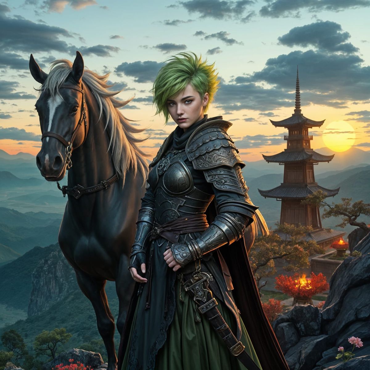 This image shows a gothic warrior woman with neon-green hair, in battle-worn armor, standing on a mountaintop next to a stallion. She is tending to a Japanese Zen garden in art nouveau style.