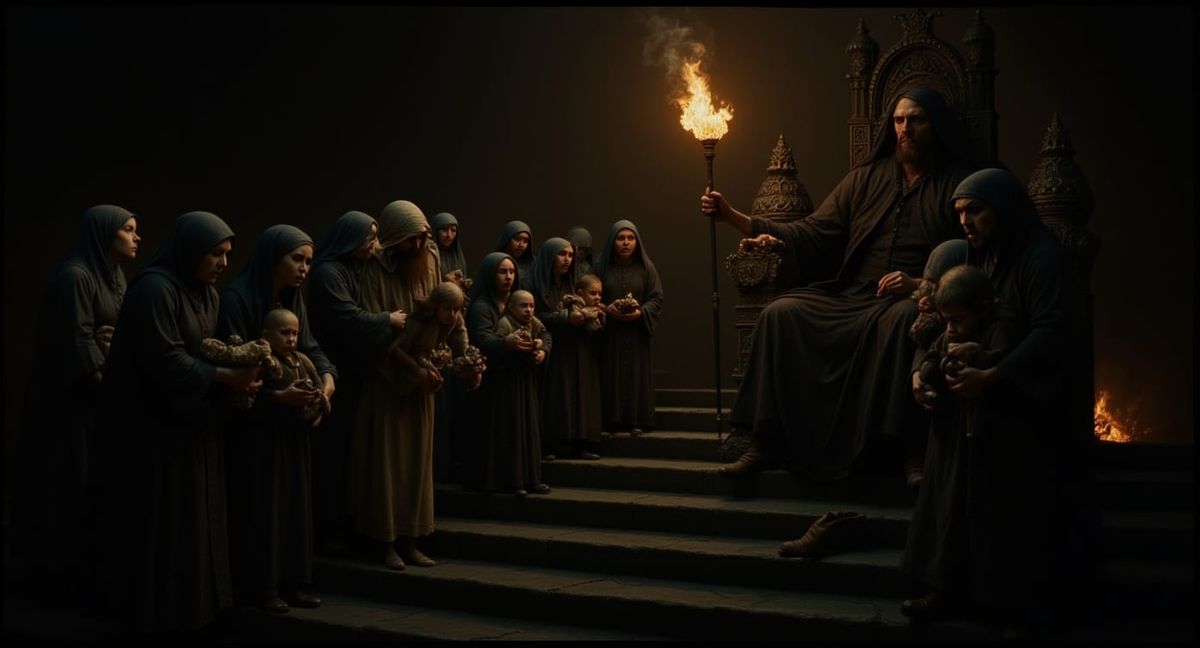 A somber image shows a ritualistic procession ascending stone steps. Cloaked women carry babies and fruits toward a monstrous figure on a throne, illuminated by firelight in a heavy atmosphere reminiscent of early 20th-century painting.