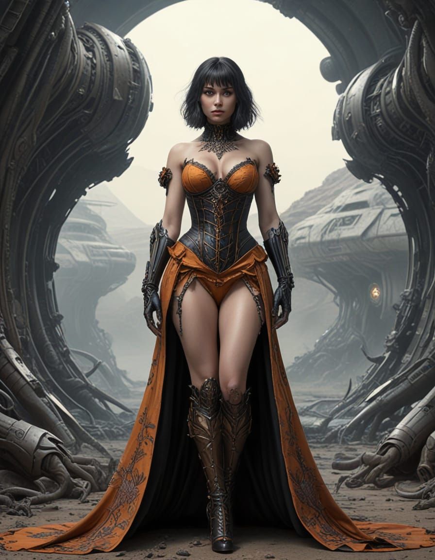 A photorealistic wide shot captures a detailed woman in an orange Elizabethan dress with a long train on a futuristic alien planet, featuring Giger-inspired aliens.