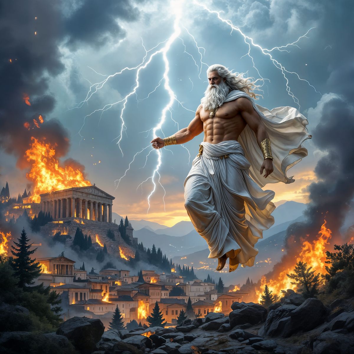 A dramatic depiction of Zeus unleashing his wrath upon a burning city. The scene captures the epic scale of Greek mythology with vivid details of destruction and despair, as a digital artwork.