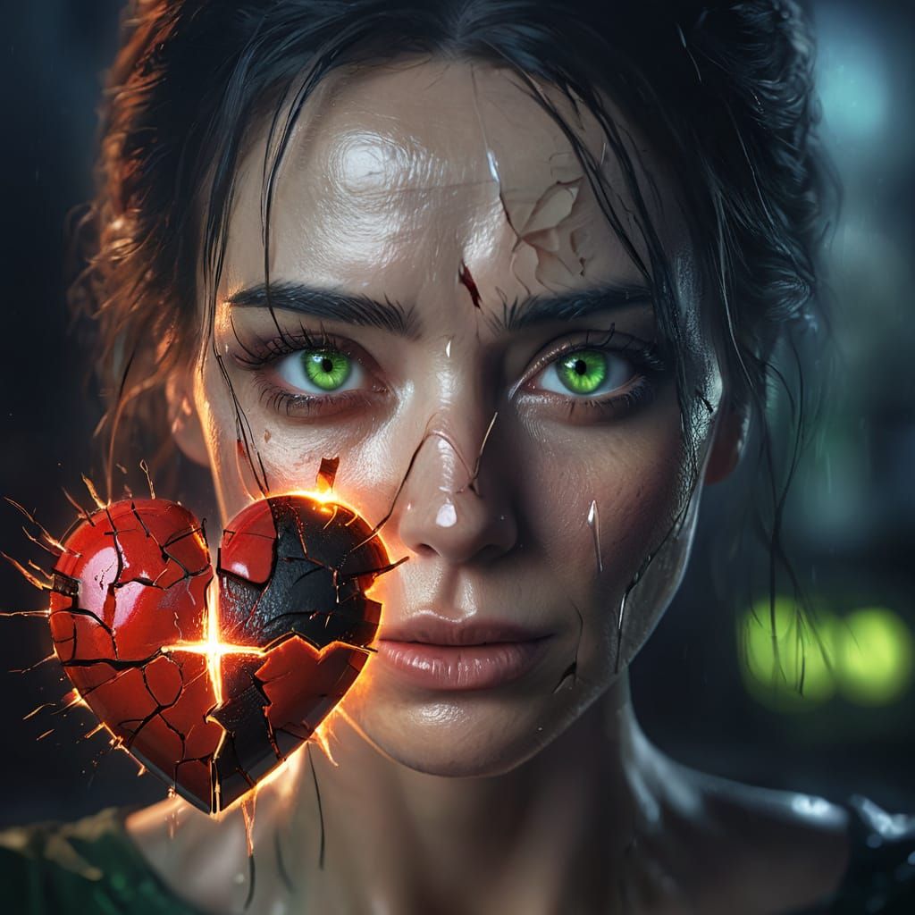 This photo-realistic image shows a woman with bright green eyes shedding a tear, conveying deep sadness. A glowing, broken heart symbolizes her heartbreak, captured with dramatic cinematic lighting.