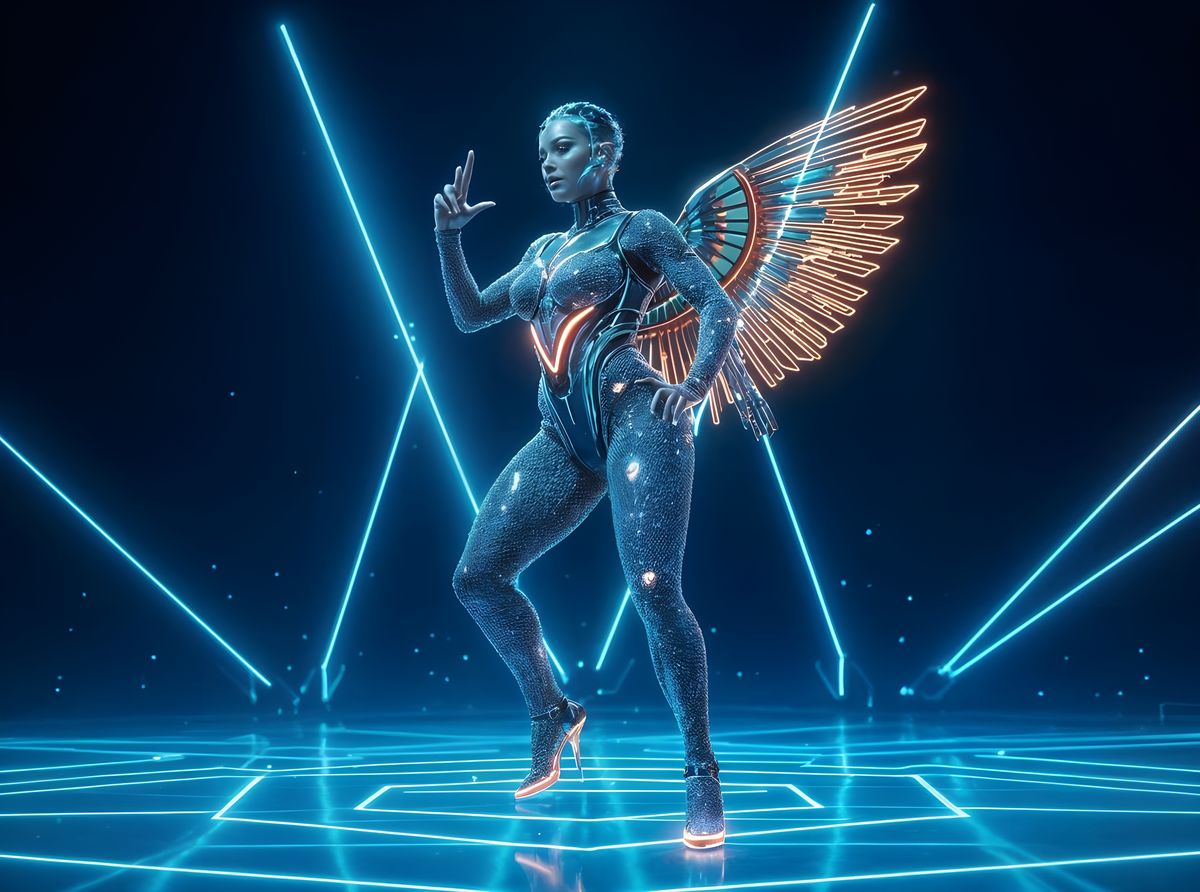 A futuristic showgirl in a glowing crystalline bodysuit dances on a holographic stage, with mechanical feathers pulsing light. Sci-fi fantasy aesthetic with neon and iridescent colors.
