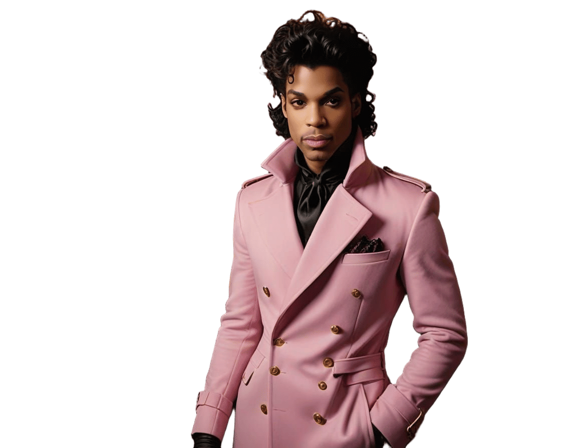 A vibrant and stylish portrayal of Prince Rogers Nelson, exuding his iconic charisma. He stands confidently, wearing a luxurious pink cashmere coat that drapes elegantly to his knees, the fabric shimmering softly under the warm glow of stage-like lighting.