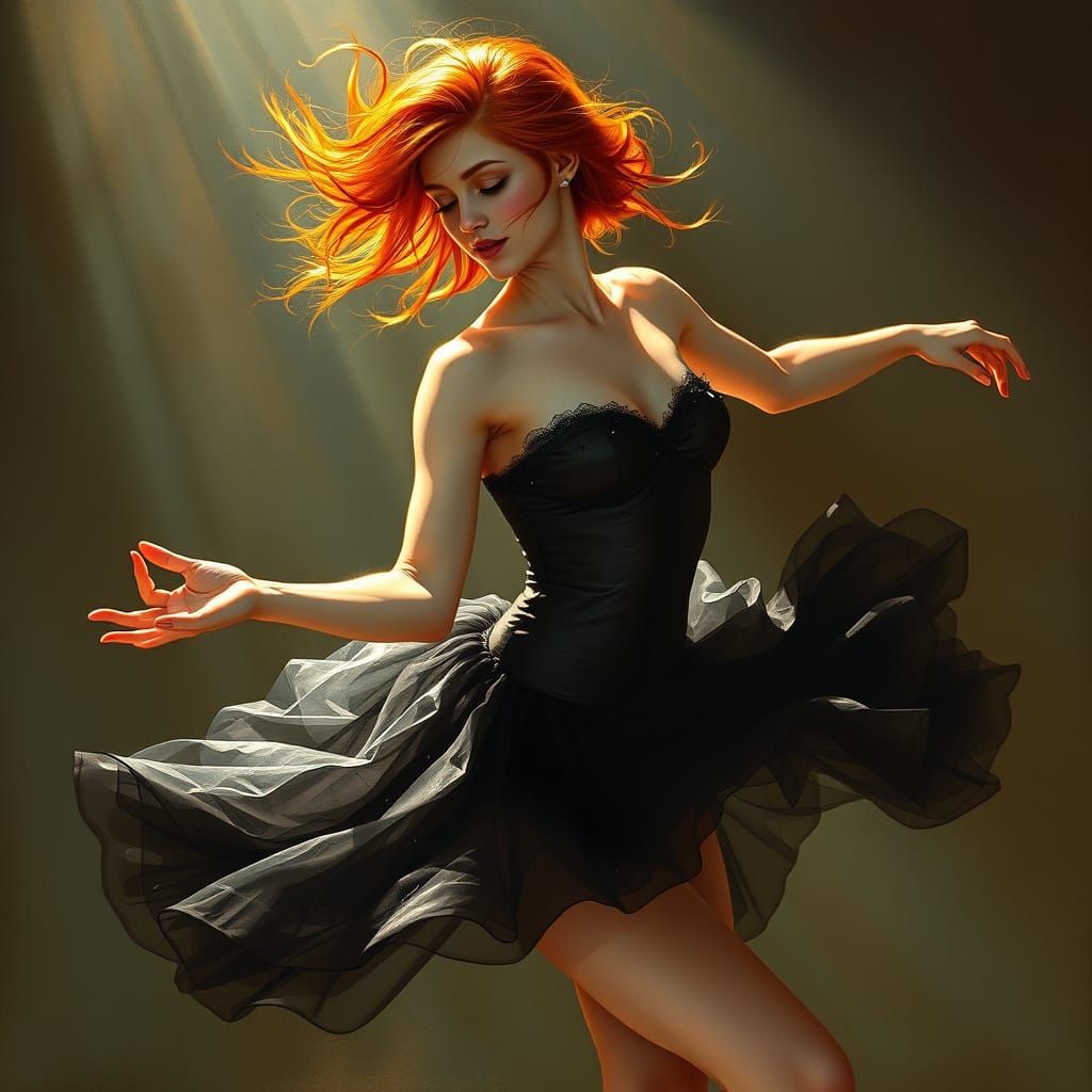 This image captures a beautiful ballerina in a dramatic, dreamlike pose, with flowing red hair and a black tutu, reminiscent of Art Nouveau style and the works of Degas and Mucha.