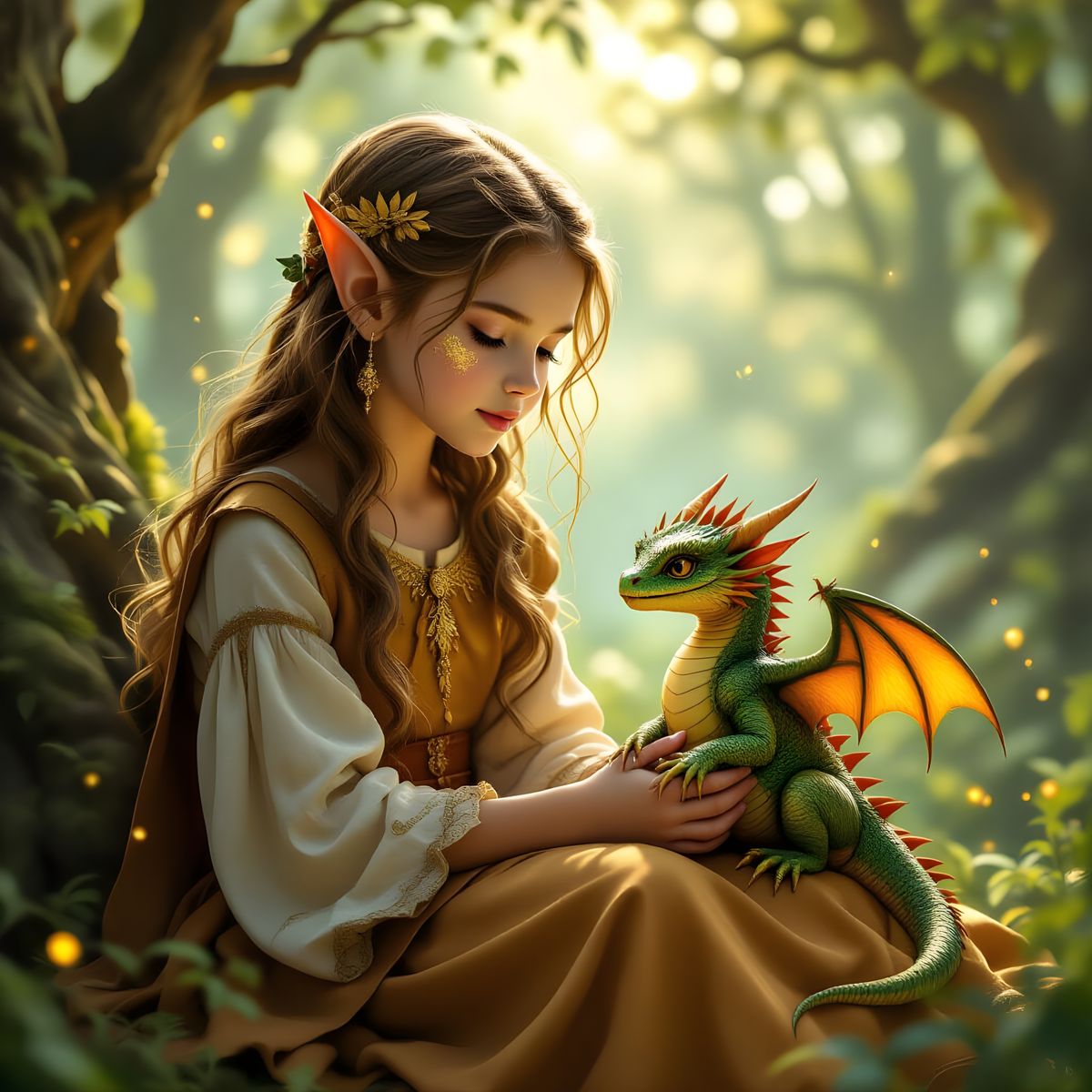 This image shows an elven girl with gold dust on her face, wearing vintage clothes, sitting with a baby dragon in a mystical forest. Rendered in a fantasy concept art style with a warm, muted color palette and ethereal lighting.