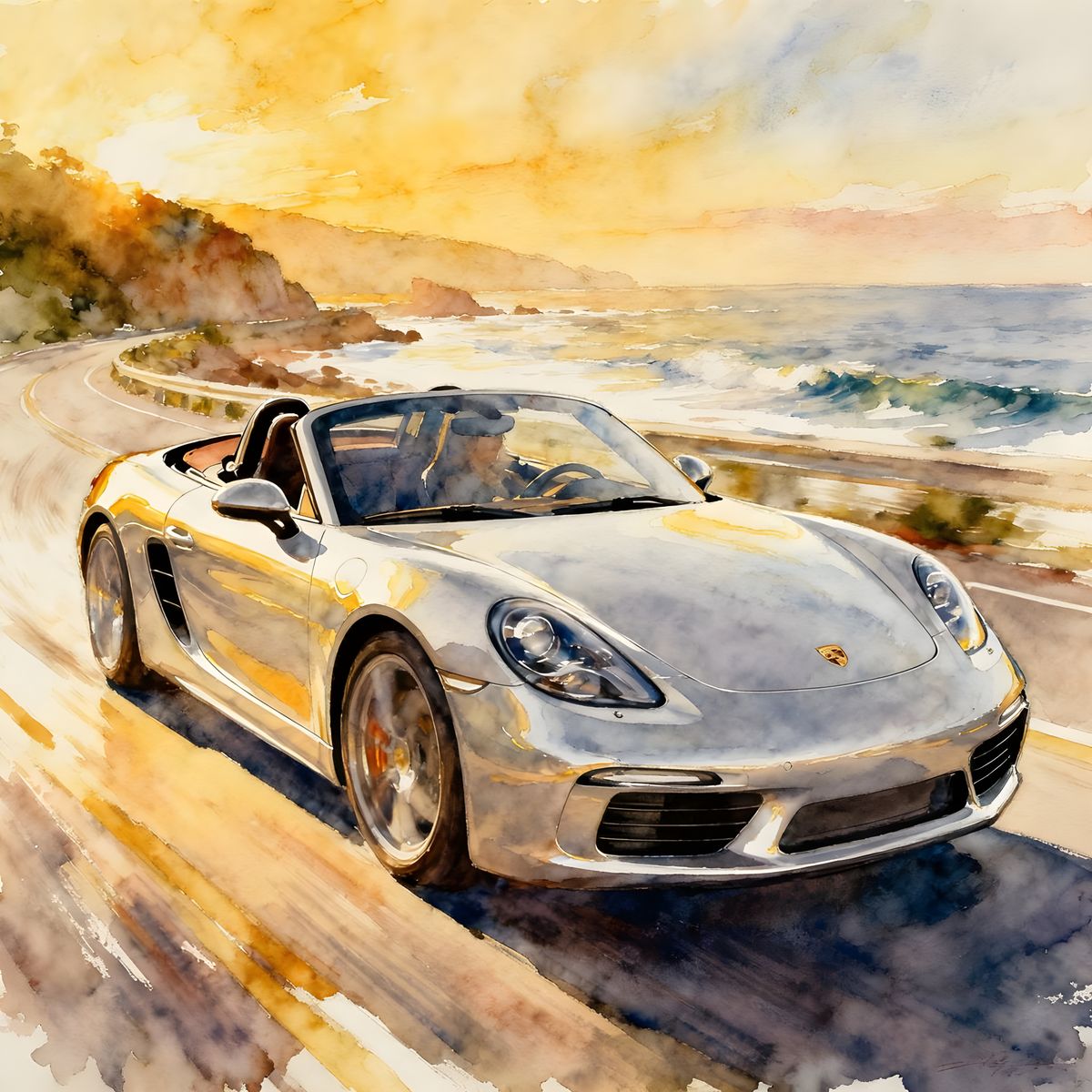 This image showcases a highly detailed digital painting of a silver convertible Porsche, rendered with delicate watercolor brushwork.