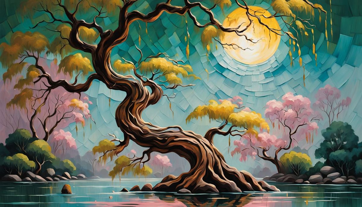 A vibrant impasto painting of a willow tree in a moonlit East Asian garden. The artwork's palpable texture, broad strokes and warm color palette create a dense, expressive atmosphere.