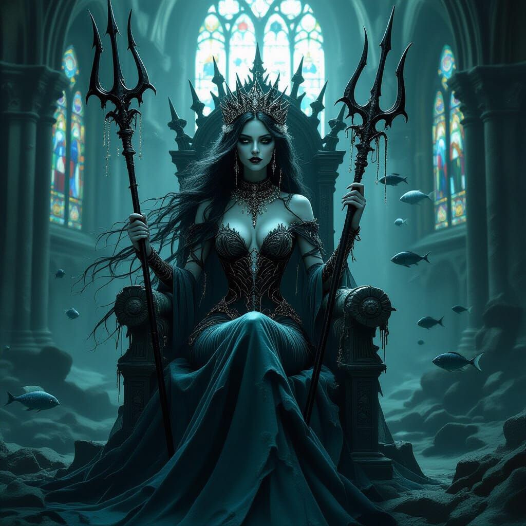 This image shows a gothic mermaid queen on a bone throne in an underwater cathedral. She holds a black coral trident, her sorrowful eyes reflecting the ruins around her, all rendered in dark fantasy style.