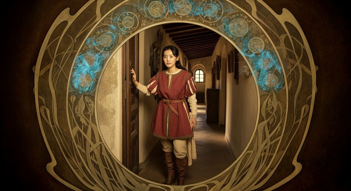 This image shows a Korean woman in Renaissance attire in an Italian farmhouse hallway. Art Nouveau details and radiating blue fire, symbols, and mathematical elements create an intricate scene reminiscent of early 20th-century art.