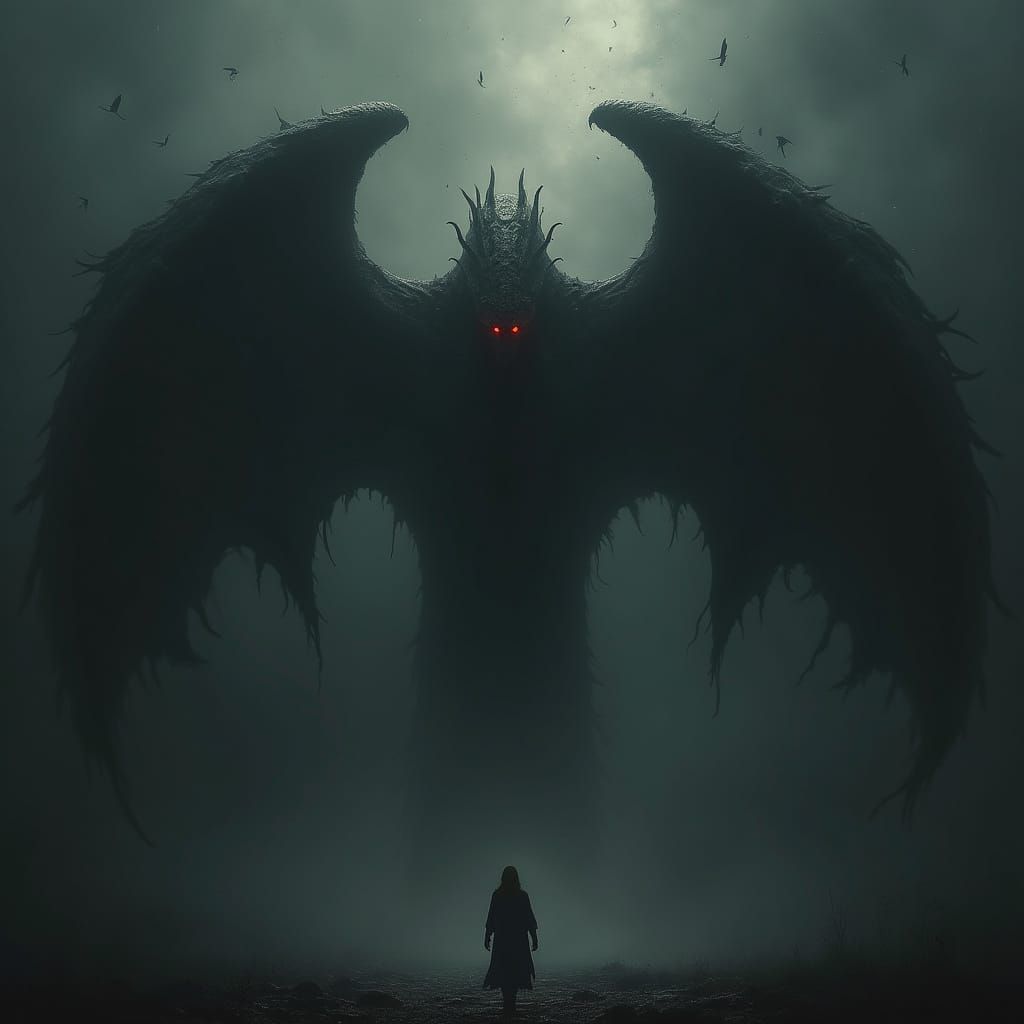 A dark entity, Tau, emerges from shadows, embodying temptation and chaos. The figure features dark wings and red eyes, in a biomechanical horror art style.