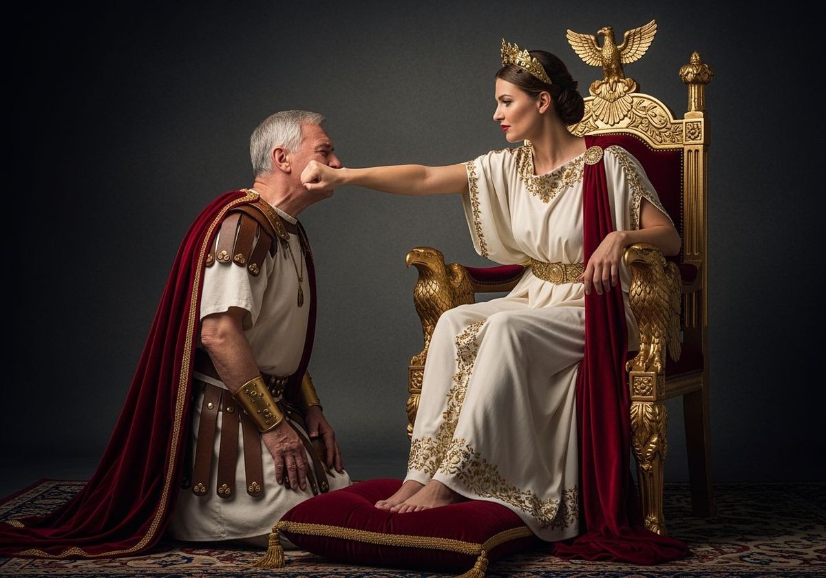 This image shows a Roman Empress on her throne, slapping a kneeling senator. The picture is lit naturally and uses a shallow depth of field, in the style of professional portrait photography.