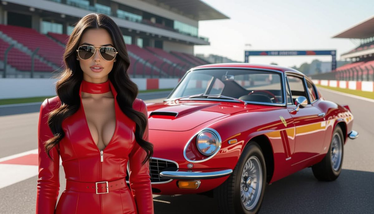 A cinematic film still of a stunning Italian fitness model in a red leather catsuit and aviator sunglasses, posing with a classic 1960s sports car in a race circuit paddock. Shot with film grain and dramatic lighting.