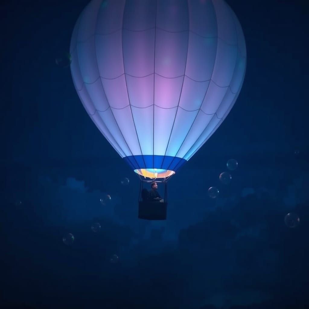 This image shows a serene hot air balloon floating through a dark night sky, its neon-lit balloon radiating a soft, pastel glow that casts a peaceful ambiance on the surrounding clouds.