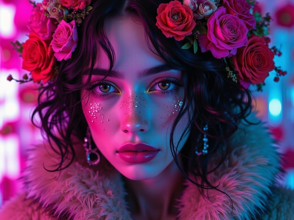 This image shows a highly detailed fortress guardian with perfect anatomy, captured in sharp focus with high contrast. The composition features a striking magenta color palette and impressive neon lighting.