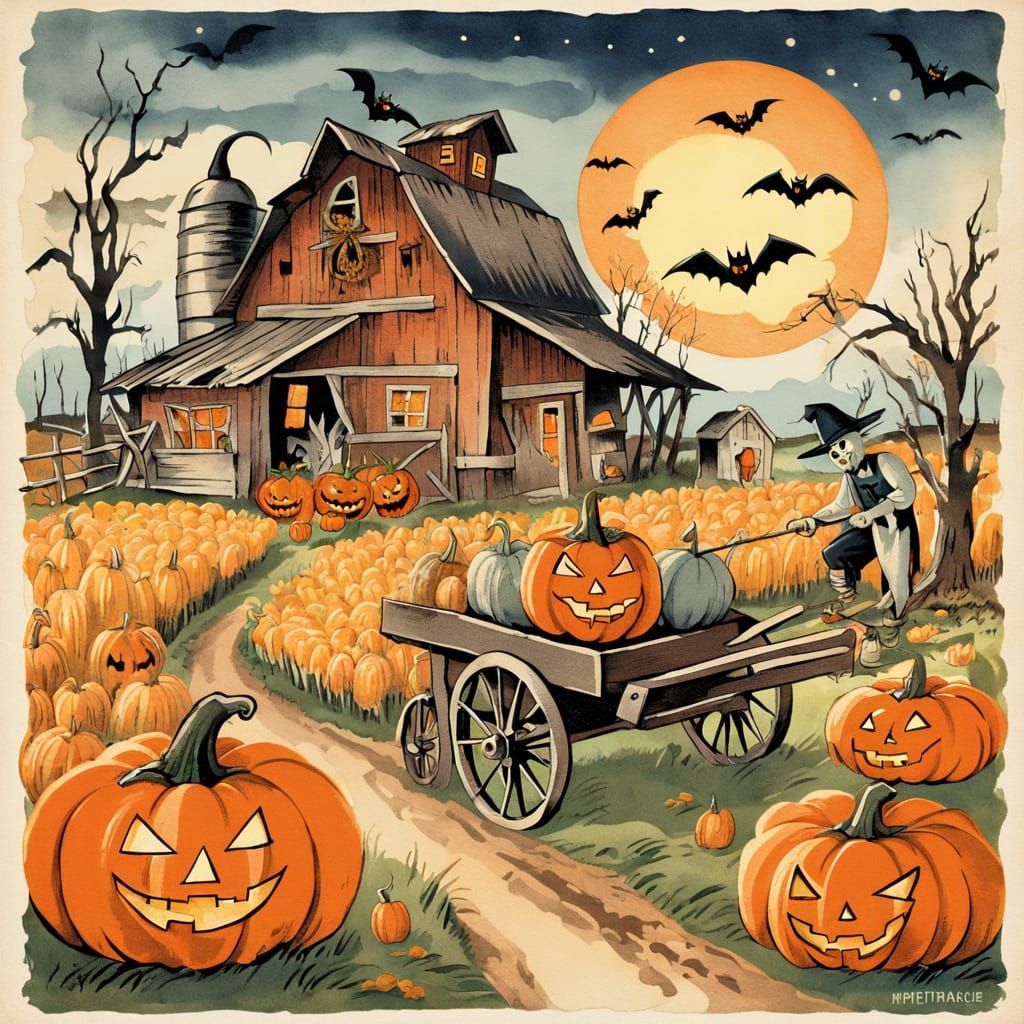 A classic vintage Halloween postcard illustration of a spooky farmyard: a crooked barn, a grinning jack-o’-lantern cart, ghostly figures in the cornfield, and a scarecrow with glowing eyes. Retro color palette, ink and watercolor look, nostalgic holiday charm.