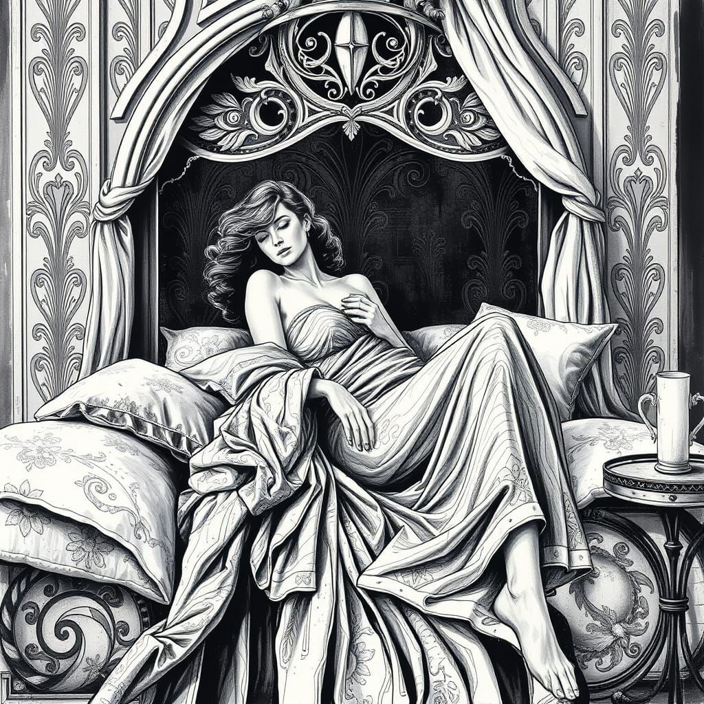A grayscale image of a beautiful woman reclining in a highly decorated art deco chamber. Her form blends into the environment with vibrant accents, in the style of expressive abstraction.