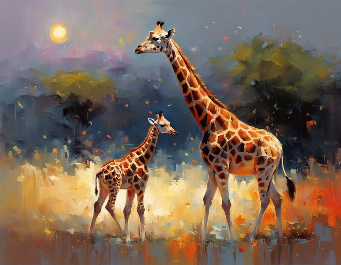 This image shows a heartwarming moment between a baby giraffe and his mother, set against a colorful African landscape. The artwork features a mix of traditional and modern styles, blending warm and inviting tones to create a captivating scene.