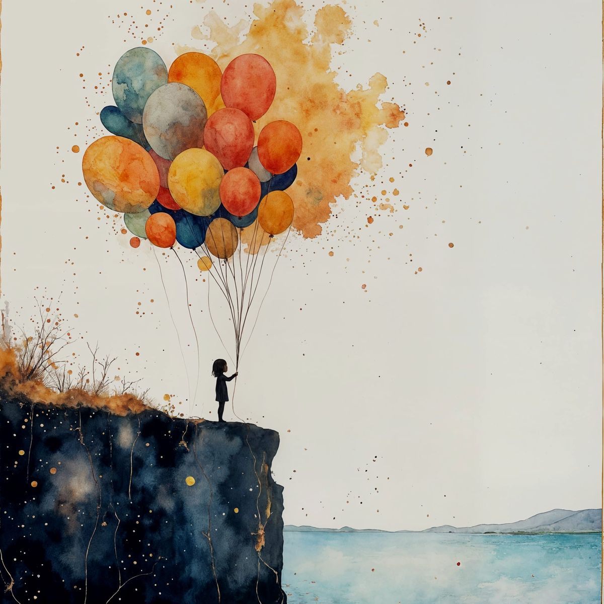 This image showcases a child on a cliff holding many balloons, depicted as a watercolor painting submerged in water. It features a hauntingly beautiful, detailed art style.
