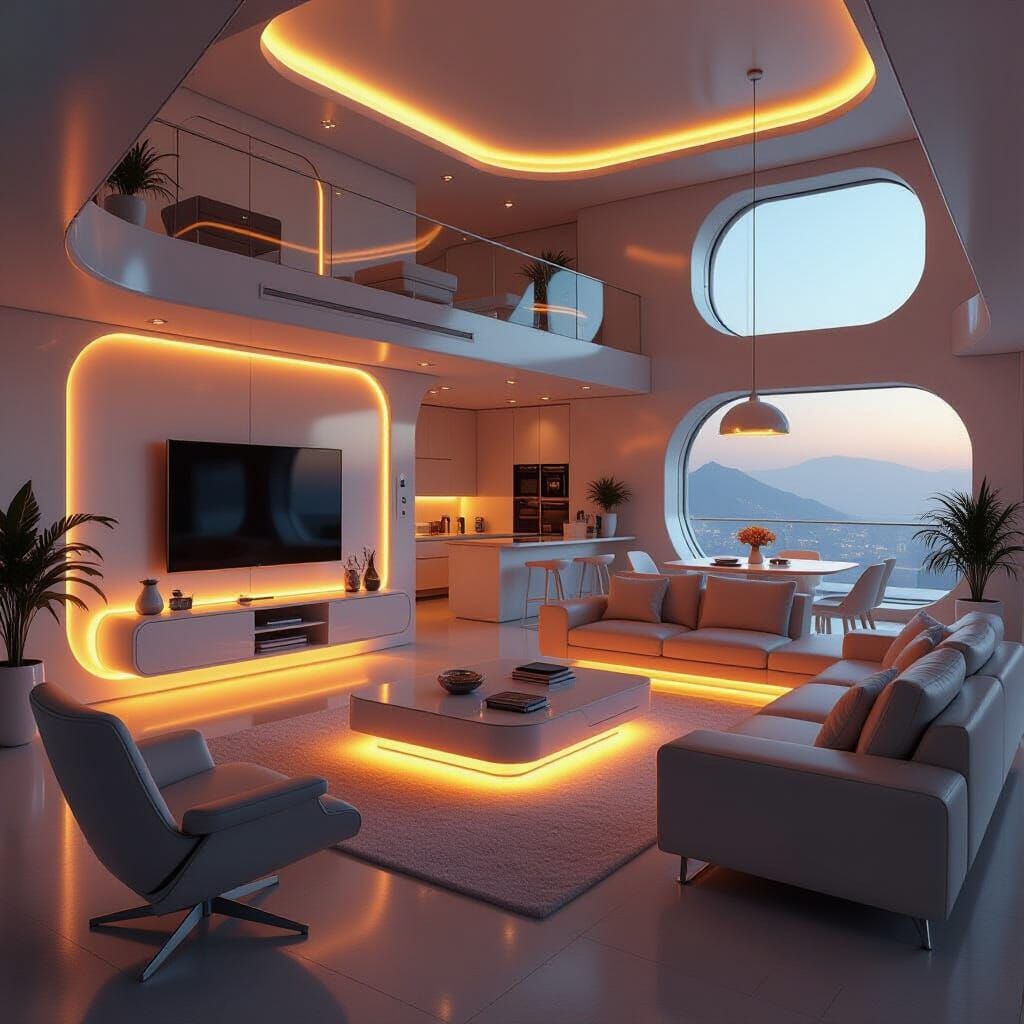 This image shows a modern, futuristic living and dining room with sleek furniture and warm lighting. The 3D rendering evokes a clean, realistic aesthetic.