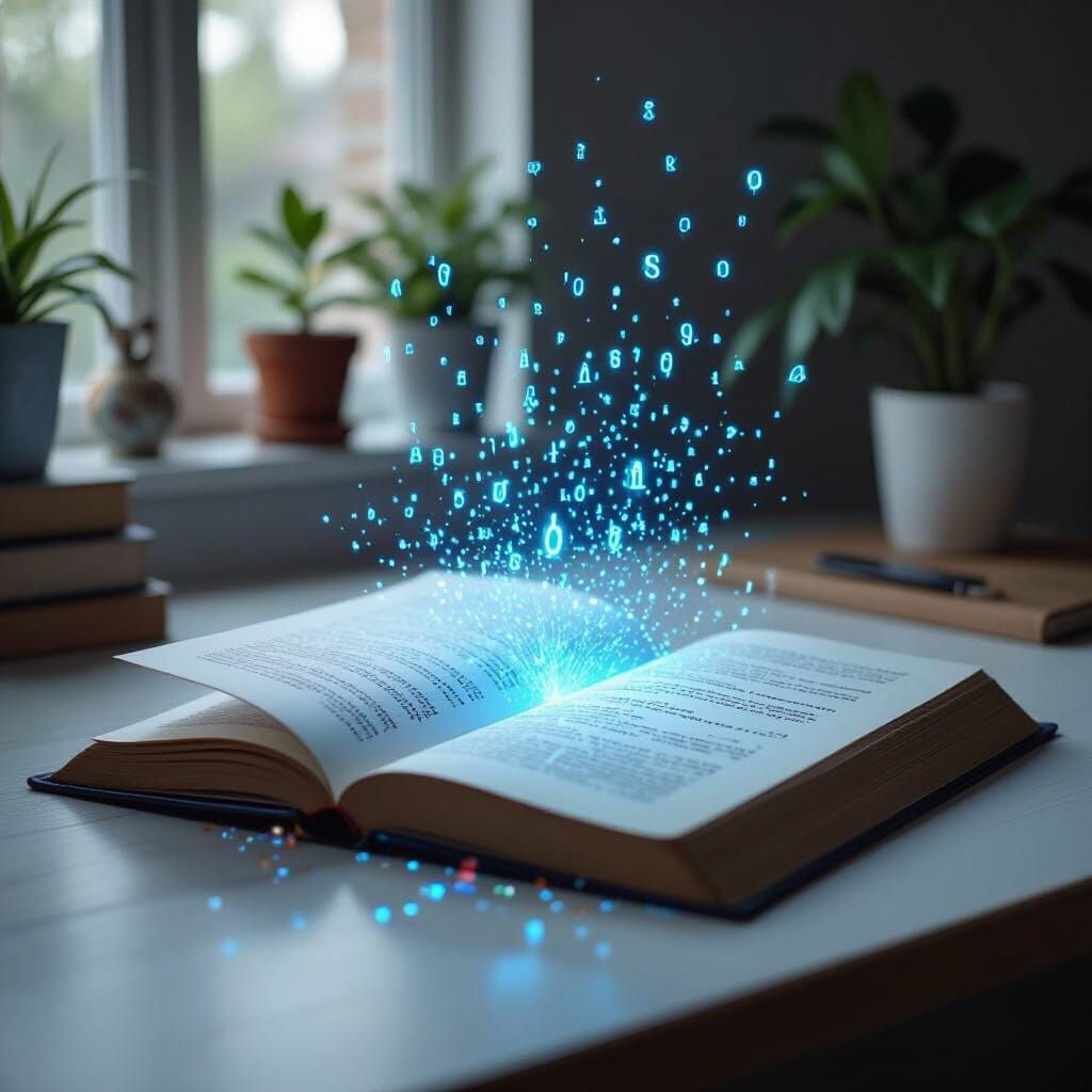 This digital painting shows an open notebook with blue words on white pages, casting ethereal, glowing glyphs onto a white desk. The atmosphere is meditative and mysterious.