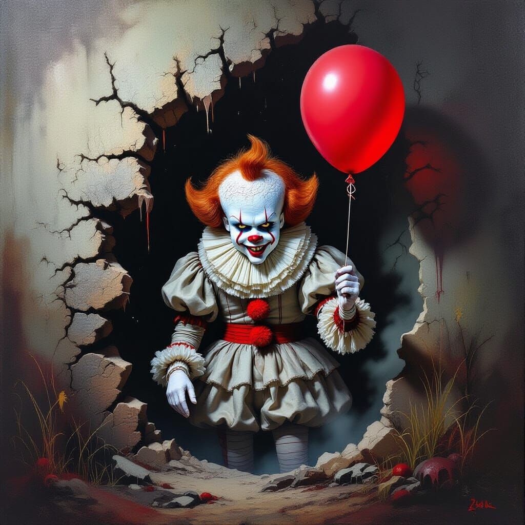 This image shows Pennywise the Clown with a bloody balloon in a dark, surreal nightmare. Artistically, it's rendered with dramatic lighting and vivid, contrasting colors to create a terrifying atmosphere.