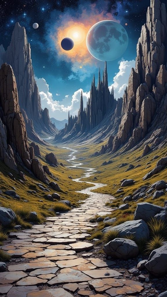 This image shows a winding cobblestone path leading to a mountain city under a sky with nebulae and two moons, rendered in a comic art style with vibrant colors and sharp linework.
