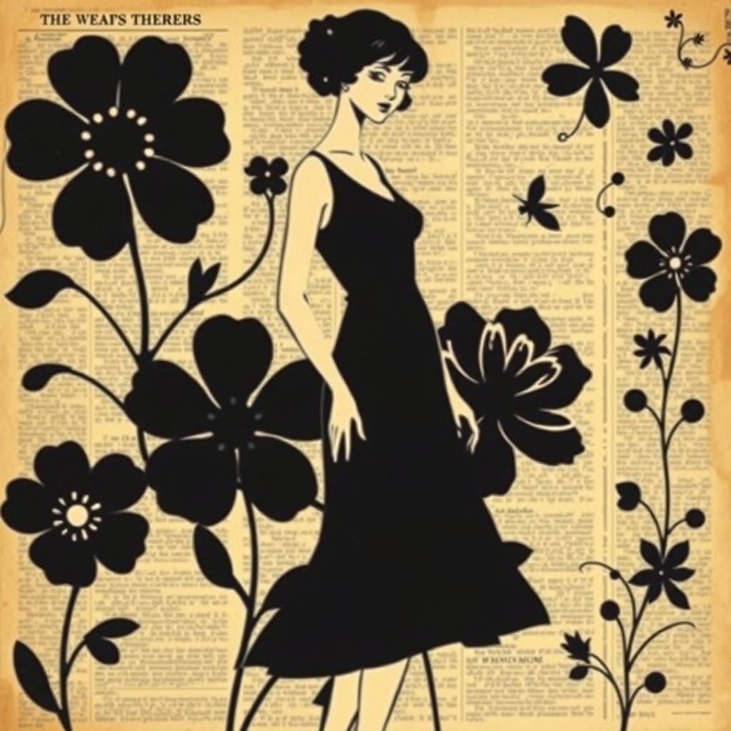This vintage collage features a stylized woman in a black dress made from newspaper clippings, set against an aged newspaper background with floral patterns. Rendered in high-contrast sepia tones.