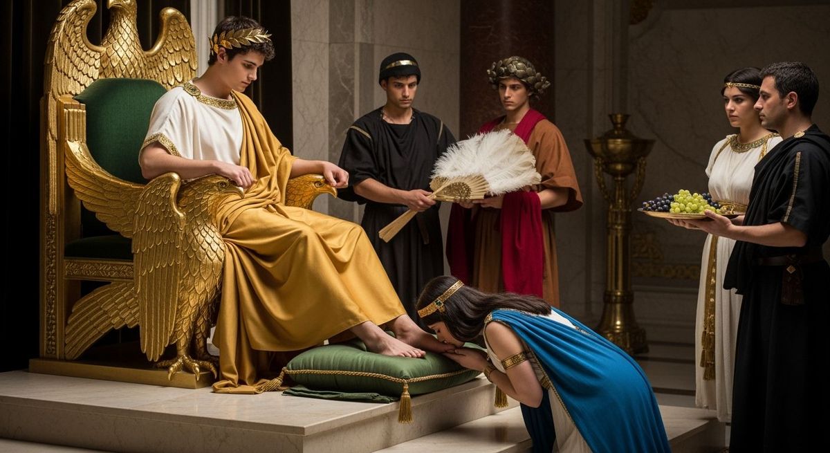 This image shows a Roman Emperor receiving homage from a kneeling Egyptian Queen in a lavish palace. The scene is reminiscent of classical paintings, using soft natural lighting and a shallow depth of field.