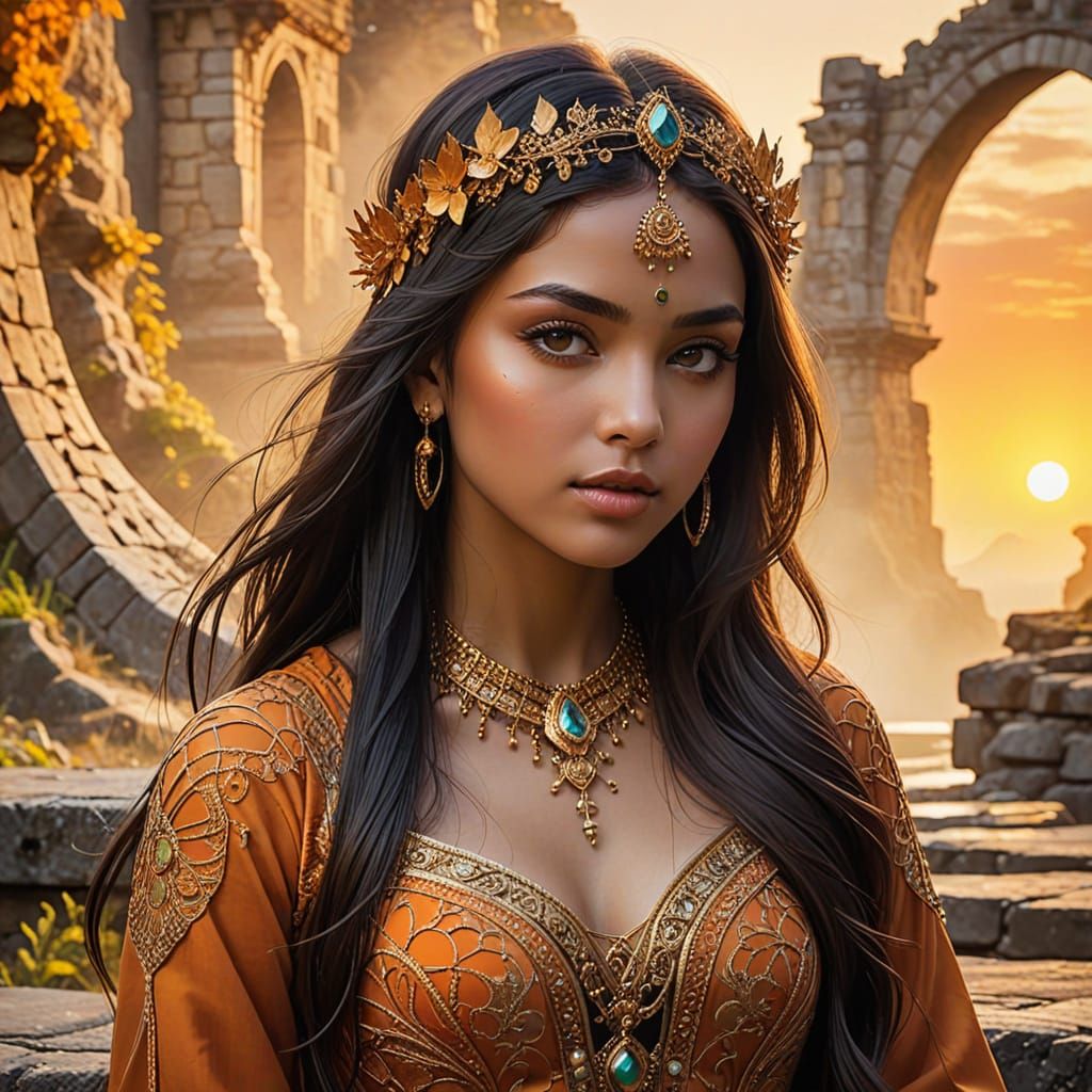 An abstract representation of a majestic Indian princess is created using geometric shapes and fractals. She is depicted sitting serenely on a stylized, ancient cobblestone bridge, symbolized through intricate patterns and flowing forms. Her saree is expressed through vibrant, abstract motifs of orange, ...
