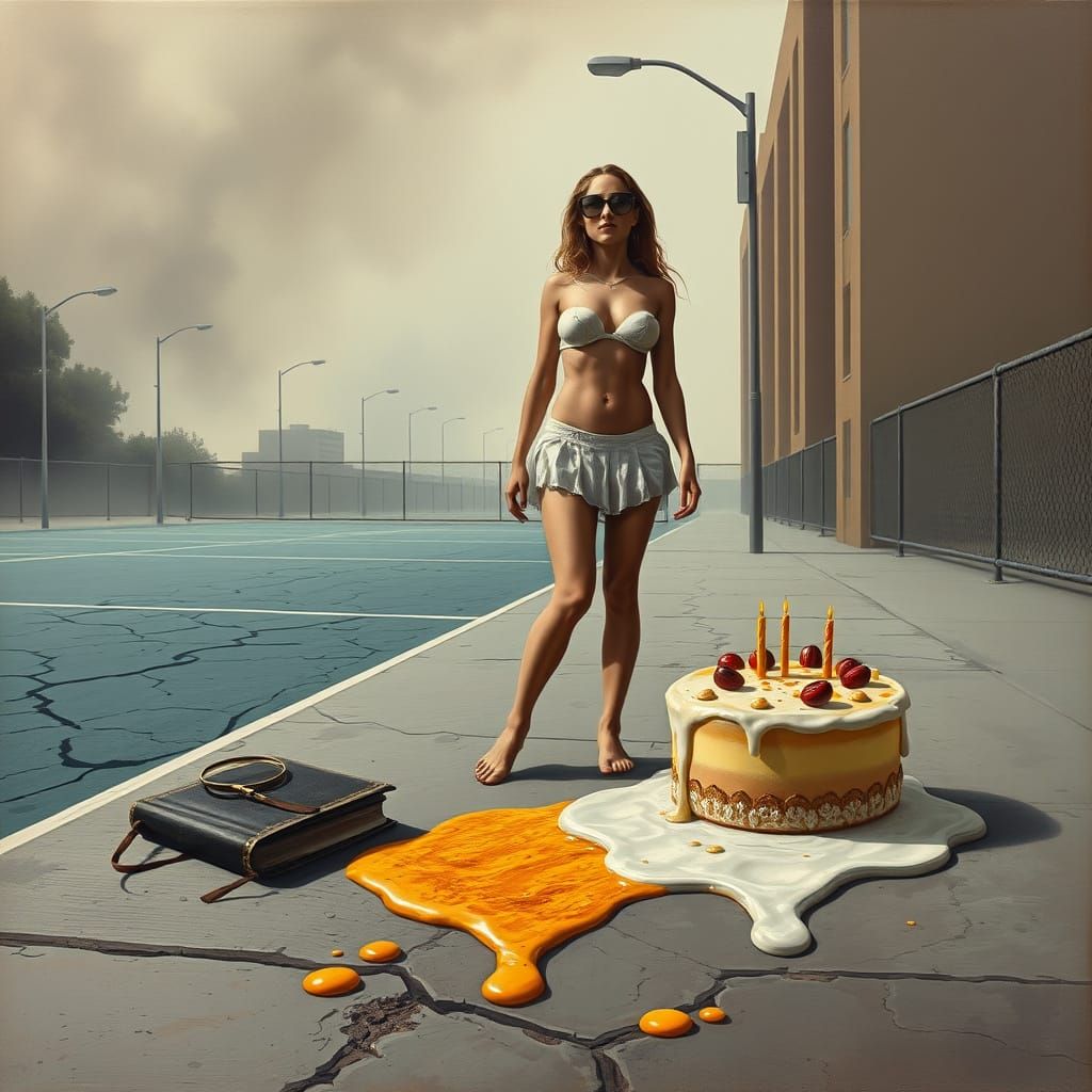 This surreal oil painting depicts Aphrodite on a cracked tennis court with melting elements. A Bible and cake are present amidst a honeycomb pattern and polluted air, evoking a dreamlike mood.