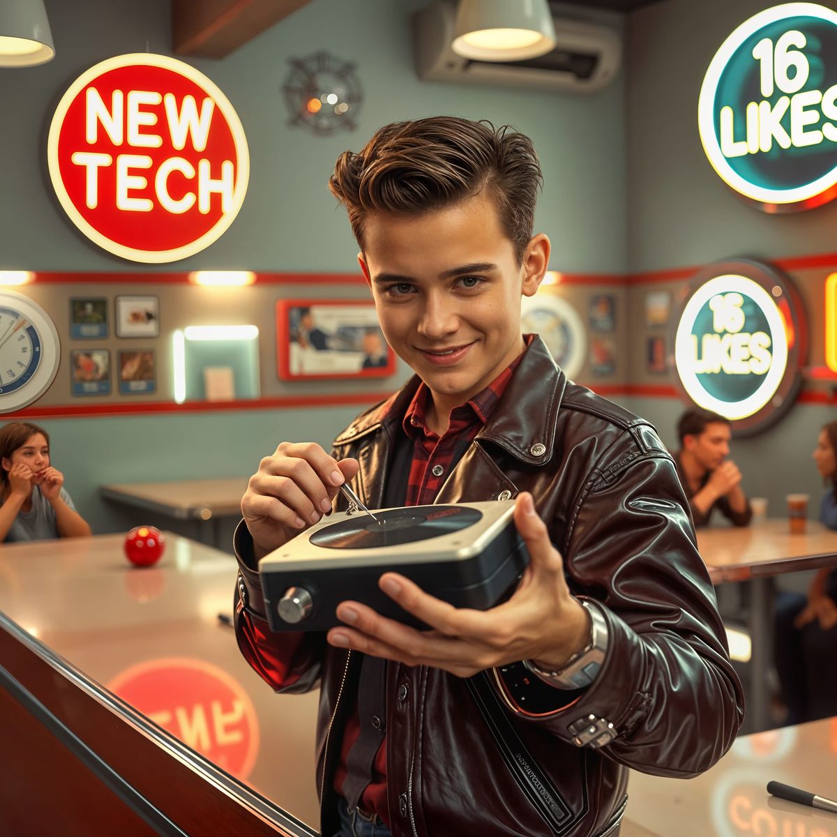 This image shows a confident 1950s influencer reviewing a portable record player in a diner, captured in a photorealistic style. Neon signs highlight the new technology and hint at modern social media culture. The scene blends classic Americana with contemporary themes.